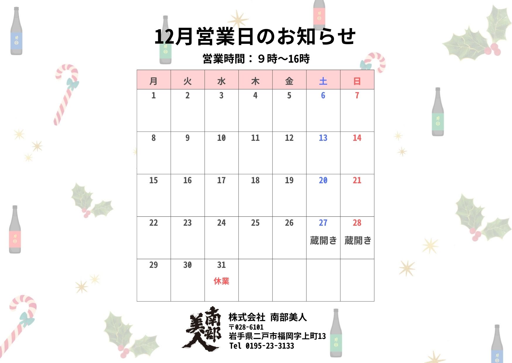 12月営業日のお知らせ