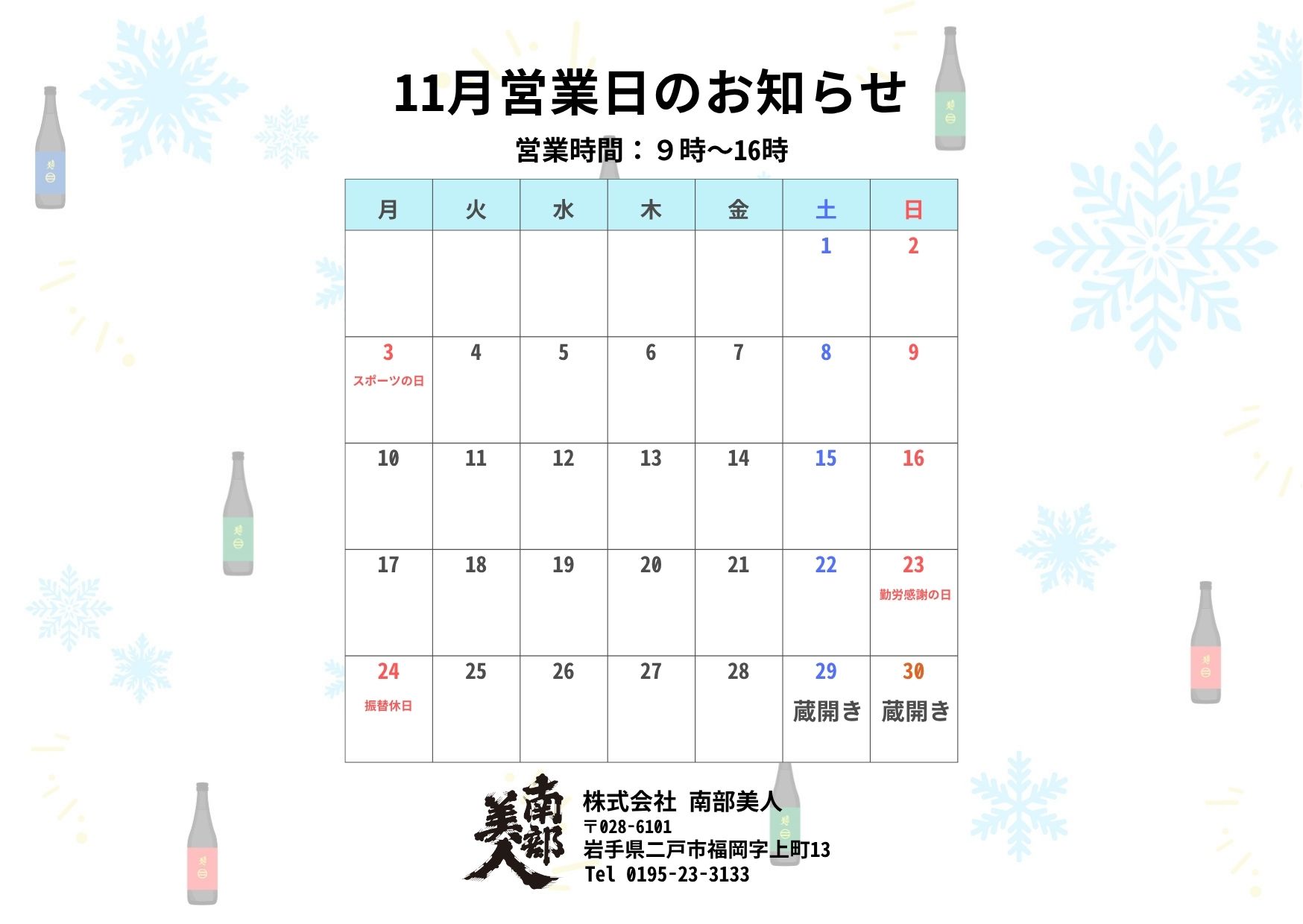 11月営業日のお知らせ