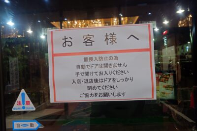 今年の秋は岩手県は熊の出没が相次ぎました。市内や繁華街にも出没しており、12月になりましたので少しは凍眠で落ち着くのかとは思っています。二戸のホテルでも写真のように自動ドアを止めて侵入されないように工夫しています。