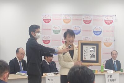 歴代総理大臣が自身でお書きになって日本酒造組合中央会へ贈っていただく「國酒」の色紙、高市総理のものを有村総務会長が中央会に持ってきていただき、全国会長会議で披露されました。来年には各蔵にレプリカが配られます。高市総理の「國酒」の字はとても力強く、大変素晴らしいと感じました。