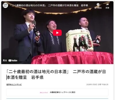 二戸市が開催する20歳の集い。ここで南部美人では、二戸市の20歳の集い実行委員会の皆さんに日本酒を今年も贈呈させていただきました。実行委員会の皆さんが毎年その年限りのラベルをデザインします。20歳になって初めて飲む日本酒は地元の日本酒、をテーマにしています。なおこのお酒は全員が20歳になってから配られます。