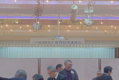 二戸岩友会と二戸経済研究会が開催する新春経済講演会が二戸パークホテルで開催されました。私も二戸経済研究会の会長として参加しました。岩手銀行の岩山頭取を講師にお迎えして県内、国内の様々な経済動向などをお話しいただきました。その後は新年会も行われました。