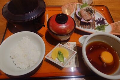 仕事で久しぶりに愛媛に来ました。鯛めしが二種類あって、今回は宇和島鯛めしをいただきました。卵の入った出汁の汁に鯛の刺身を入れて、ご飯にかける方式で、初めて食べましたが美味しくいただきました。
