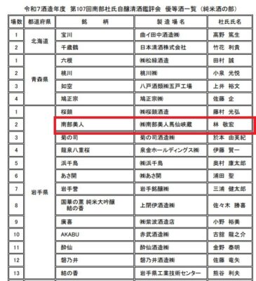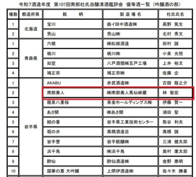 今年も開催されました第107回南部杜氏自醸清酒鑑評会において、南部美人馬仙峡蔵は吟醸の部、純米の部、両部門でダブルで優等賞をいただきました!今年は本社蔵の土蔵の仕込み蔵に大きな被害を昨年末の地震で受けたため、大吟醸や純米大吟醸を1月のシーズンで仕込むことが出来ずに、馬仙峡蔵だけの出品となりましたが、何とか両部門で優等賞をいただきました。応援していただいた皆さん、本当にいつもありがとうございます!!