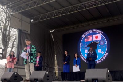 ボストン最大の日本のイベント「ボストンジャパンフェスティバル」が今年も開催されました。屋外の公園を使っての一大イベントで、二日間開催で10万人が訪れます。ステージではイベントの冒頭、在ボストン総領事館の岩手県出身である髙橋総領事より開会のご挨拶がありました。総領事も鬼滅の刃の主人公竈門炭治郎が着る市松模様の法被を纏い登壇してご挨拶をされました。